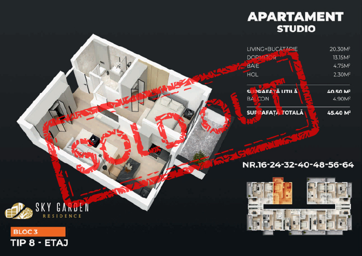 Fie că îți dorești un apartament pentru locuit sau o a doua locuință, Sky Garden Residence îți oferă opțiunea de a-l prelua la cheie, complet mobilat și amenajat de o echipă de design interior. Îți alegi stilul preferat, iar noi ne ocupăm de tot – de la finisaje, la mobilă și decorațiuni. Te muți fără bătăi de cap, cu valiza și visul împlinit.